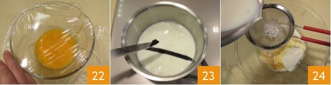 cover with plastic wrap 22 and leave them at room temperature, then cut the vanilla pod lengthwise and scrape the seeds with the back of the knife. In a saucepan, pour the milk and add the seeds along with the split pod 23, turn on the heat and warm until almost boiling. When the milk is hot, filter it into the bowl with the egg and sugar mixture 24,