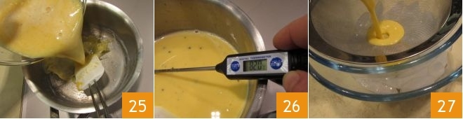 mix well and then pour everything back into the saucepan 25. Cook the custard over low heat, stirring continuously until it reaches 180°F 26 (using a kitchen thermometer is essential to check the temperature), and once the custard is ready, strain the mixture into a bowl placed over another bowl filled with ice 27;