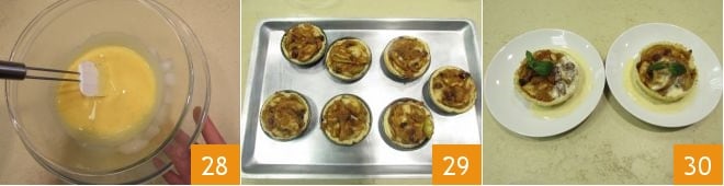 Stir with a spatula until completely cooled 28: this operation will quickly lower the temperature of the custard while preserving its taste, color, and texture. Once cooking is complete, take the apple puff pastry tarts out of the oven 29 and serve them with the now cold custard and a few fresh mint leaves 30!