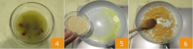 Let the raisins soak in the orange juice 4 while you continue with the preparation. In a pan, melt the butter over very low heat; once melted, add the breadcrumbs 5 and toast them for a few minutes, stirring often with a wooden spoon. Then turn off the heat and set aside 6.
