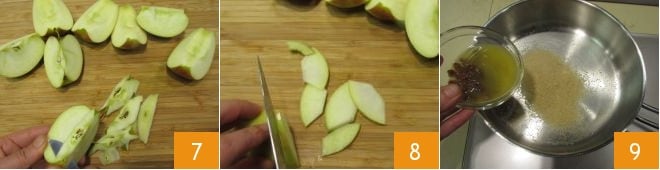 Wash and dry the apples, quarter them and remove the core 7, then without peeling them, cut each quarter into slices approximately 1/8 inch thick 8. In another high-sided pan, pour the sugar, and add the raisins with all the soaking juice 9.