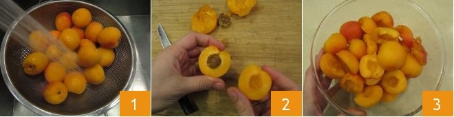 To make apricot chutney, wash the apricots well 1, then dry them, cut them in half 2, and remove the pit. Collect the pitted apricots in a bowl and set aside.