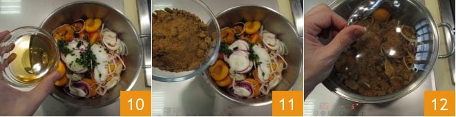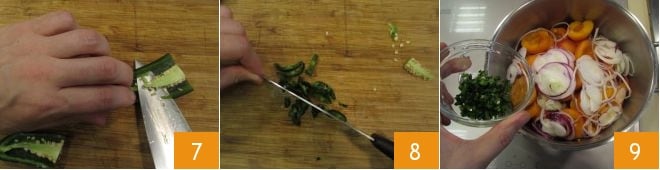 remove the seeds with a knife 7 and chop it 8. In a large pot, pour in the apricots, spring onion, chili pepper 9,