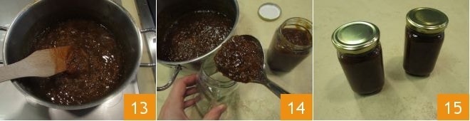 The chutney is ready 13: if you want to consume it immediately, you can let it cool and pour it into jars (14-15), if instead you want to store it longer, transfer it while still hot into previously sanitized jars, fill the containers up to .5-.75 inches from the edge, close with lids, invert the jars, and let cool.