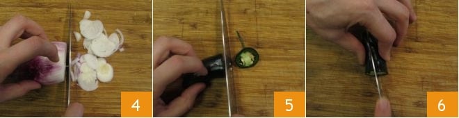 Clean the spring onion and slice it 4. Remove the stem from the chili pepper 5, cut it in half lengthwise 6,