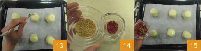 Create holes on top using the tines of a fork 13. Now mix the flax seeds with pink peppercorns 14 and garnish the apricots 15.
