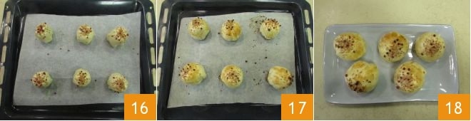 The apricots in puff pastry are ready for baking 16: bake in a preheated static oven at 392°F for 15-18 minutes on the middle rack until golden brown. Once ready, take the apricots out of the oven 17 and let them cool slightly before serving 18.