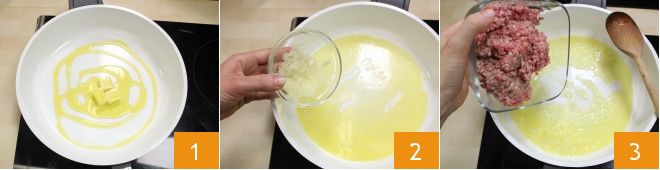 To make the spaghetti arancini, start by preparing the meat ragù: in a non-stick pan, melt the butter with a little oil over low heat 1, then add the finely chopped onion 2 and let it brown for a few minutes. When the onion has softened, add the ground meat and brown it over high heat for 5 minutes 3;