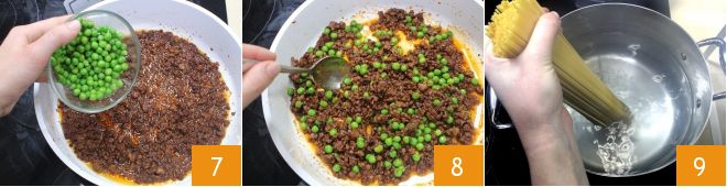When the meat is almost cooked and the sauce has thickened, add the frozen peas 7 and finish cooking, stirring often to prevent the ingredients from sticking to the bottom of the pot 8. Once ready, let the meat and pea ragù cool and place it in a bowl covered with plastic wrap, then store it in the refrigerator. Bring plenty of salted water to a boil and cook the spaghetti 9.