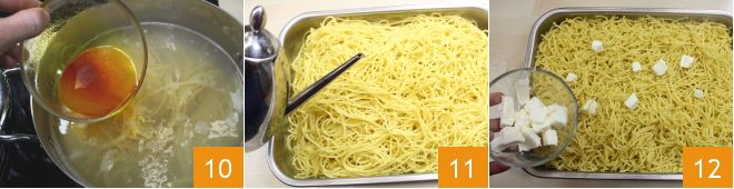 Meanwhile, dissolve the saffron powder in a little cooking water and add it to the pasta 10. When the spaghetti is cooked (we recommend not draining it al dente), drain it and place it in a baking dish with some oil to prevent it from sticking 11. Let it cool completely, then season it with butter 12;
