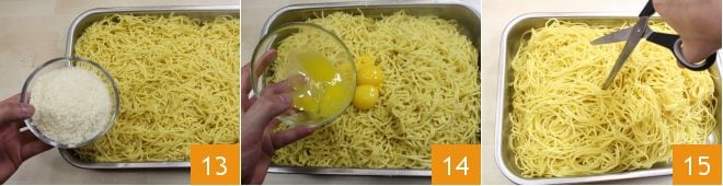 And grated Parmesan cheese 13, season with salt, and add the egg yolks 14. Mix all the ingredients well and proceed to cut the pasta roughly, using kitchen scissors 15.