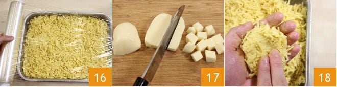Now cover the baking dish with plastic wrap and place it in the refrigerator overnight 16. After the indicated time, remove the pasta and ragù from the refrigerator, then cut the scamorza into cubes 17. Start assembling the arancini by taking a bit of spaghetti and forming a ball, using two fingers to create a hole in the center 18;