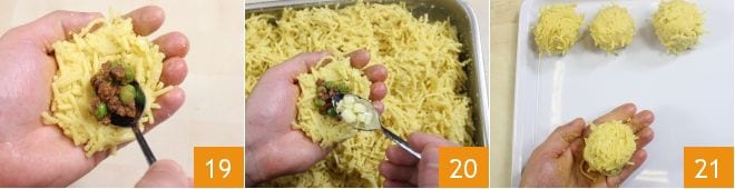 And add a teaspoon of ragù 19 and a few pieces of cheese 20. Using the pressure of your hands, close the arancino and place it on a tray. Proceed in the same way until all the arancini are formed.