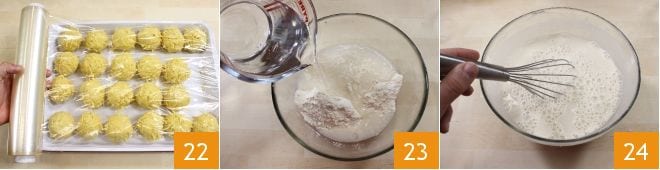 Cover everything with plastic wrap and place in the refrigerator for about ten minutes. Meanwhile, prepare the batter by putting flour, water, and a pinch of salt in a bowl 23. Using a whisk, combine all ingredients until you have a smooth, lump-free mixture 24.