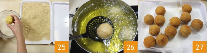Heat the oil for frying and start passing the arancini, one by one, first in the batter and then in the breadcrumbs 25. When the oil is hot, begin frying them for 5-6 minutes at most 26, or until the coating is golden (to check if the oil is at the right temperature, do the toothpick test: dip the tip of a wooden stick into the oil, if you see it start to fry then it is hot enough). Let the arancini drain on a tray lined with absorbent paper so that they lose all the excess oil 27. Then your spaghetti arancini will be ready to be enjoyed!