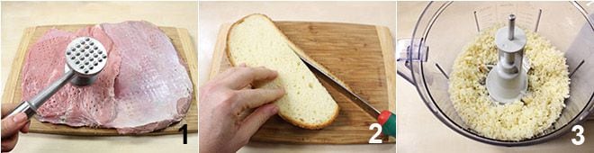 To prepare the veal roll with vegetables, pound the meat with a meat tenderizer 1 and remove any fat or cartilage, then salt and pepper the surface. Prepare the meat filling: take the bread, remove the crust with a knife 2, reduce it to crumbs with a mixer, and transfer it to a large bowl 3.