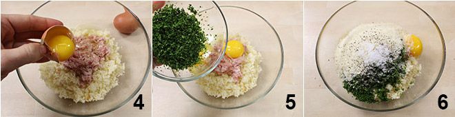 Add finely chopped smoked bacon, two egg yolks 4, chopped parsley 5, Grana Padano PDO 6, then salt and pepper.