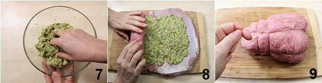 Mix all the ingredients with your hands 7 and place the mixture obtained on the meat, leaving a border of about 1 inch all around. Roll the meat onto itself 8 and tie it with kitchen string, as shown in figures 9