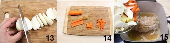 Clean the vegetables, then slice the onion 13, dice the carrots 14, and the potatoes, then add them to the meat 15.