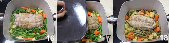 Clean and trim the green beans, then add them to the meat 16 and cover with a lid to continue cooking without dispersing steam. The ingredients inside the pot will cook for about 60 minutes over low heat, without adding water: the liquids released by the meat and vegetables will provide the right level of moisture needed to ensure the roll cooks through, rendering it tender and not tough. After the indicated time, poke the roast with a toothpick to check cooking: if the liquids that come out are clear, the meat is cooked. Turn off the heat and, without removing the lid, let the meat rest for about 10 minutes in the warmth, then slice the roll and serve it along with the stewed vegetables.