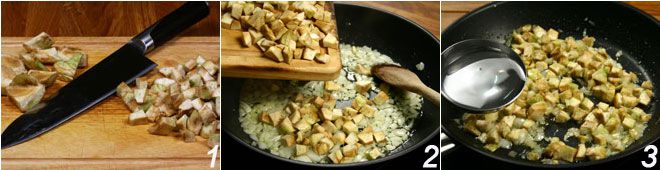 Start by cleaning the How to clean artichokes: remove the tough outer leaves; once you reach the heart, cut it into 4 parts and place all the pieces in a solution of acidulated water (water and lemon juice). Clean and chop an onion and let it brown in a pan with 3 tablespoons of olive oil; drain and cut the artichokes into small squares 1, then add them 2 to the onion and let them cook over low heat for about 15-20 minutes, covering with a lid and adding, when needed, some vegetable broth (or hot water) 3.