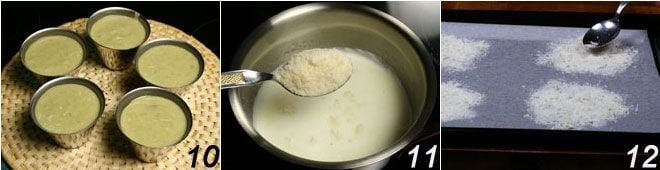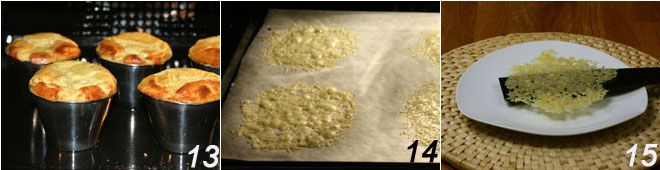 and fill them by dividing the artichoke mixture obtained 10. Bake the artichoke flans for about 35-40 minutes in a preheated oven at 350°F. In the meantime, prepare the parmesan sauce by placing the cream in a small saucepan and bringing it to just below boiling; then add the parmesan 11, and stir to melt it. Finish by adjusting with salt and pepper. At this point, also prepare the Parmesan Wafers: line a baking sheet with parchment paper, then distribute 5 tablespoons of grated cheese on the surface forming 5 circles 12 about 4 inches in diameter.