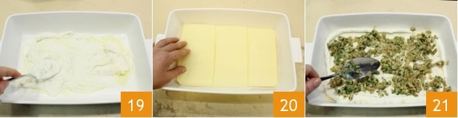 and cover with a layer of ricotta cream 19, then lay a layer of lasagna on the bottom 20. Continue with a layer of ricotta cream and one of sautéed artichokes 21;