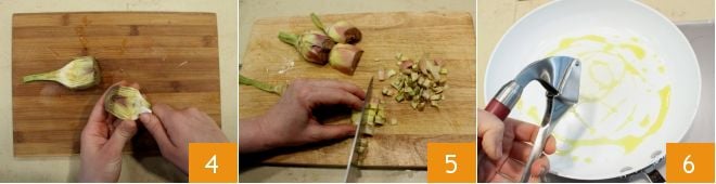 and remove the inner beard with a paring knife 4 then finely chop them with a knife 5. In a large pan, lightly sauté the chopped garlic with a drizzle of oil 6.