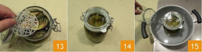 insert a plastic spacer to press the artichokes well into the jar 13; at this point, close the jar by inserting the gasket 14. To finish, proceed with pasteurization, or boiling the jars, following the guidelines of the Ministry of Health 15. Once ready, let them cool completely, then store your artichokes in oil in the pantry. Let the preserve rest for half a day. If you notice that during this time it has absorbed a lot of oil, you can top it up, ensuring to pasteurize again. When you go to consume the artichokes in oil, check that the vacuum seal has occurred: pull the tab, and if it resists and you hear a "pop" sound, the vacuum seal has been achieved correctly. Otherwise, if the vacuum seal hasn't been achieved correctly, the preserve should not be consumed.