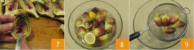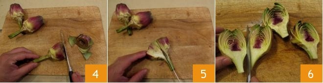 At this point, cut off the tips to get the heart of the artichoke 4 and cut the artichokes in half (5-6).