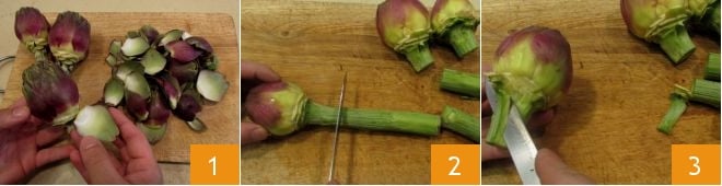 To make the artichokes in oil, start with sterilizing the jars. We used jars with airtight seals, so you can boil them by removing the rubber gaskets. For proper sterilization, follow the guidelines of the Ministry of Health, as described at the bottom of the page. Start by How to clean artichokes: fill a bowl with water and squeeze in lemon juice, which will help preserve the cleaned artichokes from browning. Begin by removing the outermost tough leaves to reach where the leaves start to be white at the base of the flower 1; cut the tougher part of the stem, keeping a few initial inches under the flower 2, then peel the stem to remove the tougher part 3.