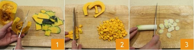 To prepare the autumn lasagna, start with the pumpkin: cut it into wedges and then remove the skin and seeds 1, dice the flesh 2, and thinly slice the leek 3.