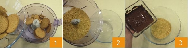To prepare the avocado cheesecake, start with the base: finely crumble the cookies using a food processor 1, then transfer them to a bowl 2. Melt the dark chocolate in the microwave or in a double boiler; once cooled, pour it over the crumbled cookies 3