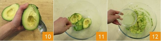 then remove the flesh with a spoon 10 and gently mash it in a bowl with a fork 11. Sprinkle with 1 tbsp of lime juice 12 and mix.