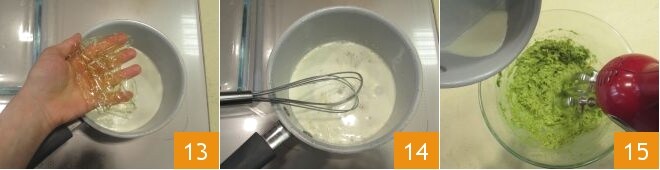 Pour the cream into a small pot and bring to just below boiling; when the gelatin has softened, gently squeeze it and add it to the hot cream 13, stirring everything thoroughly with a whisk (it's important for the gelatin to dissolve completely) 14. With electric whisks at medium speed, work the mashed avocado, pouring in the cream and gelatin mixture 15,