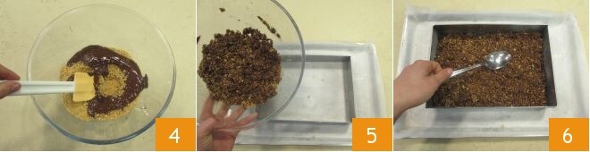 and mix thoroughly 4. Line a shallow baking sheet with parchment paper, then place a rectangular bottomless mold measuring 10x7 inches. Pour the cookie and chocolate mixture inside and level it with the back of a spoon 6. Place the mold in the fridge for at least an hour to let the cookie base set properly.