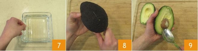 Meanwhile, prepare the cream: soak the gelatin sheets in a small bowl with cold water 7 for at least 10 minutes. Meanwhile, halve 2 avocados 8: first remove the pit (if you don't discard it, you can let it sprout by immersing it in water ensuring the base of the pit is well submerged),