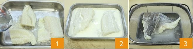 To prepare bacalhau à Braz, start by desalting the cod: put it in cold water for about 24 hours, making sure to change the water 3-4 times 1, and for the last soak, use milk, which will not only soften the fish but also sweeten it 2. If you are using already soaked cod, soak it in milk for an hour. After the indicated time, drain the cod 3, remove the skin and bones (to make this operation easier, immerse the fish for a few minutes in hot water).