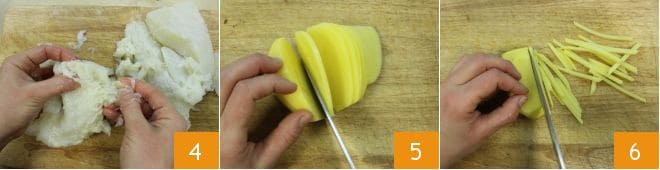 Shred the cod with your hands 4 and set aside the flesh. Wash, peel the potatoes, and then first cut them into slices 5 and then into thin sticks of 1/8 inch 6.