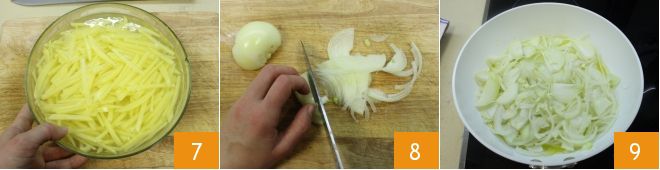 Place the potato sticks in a bowl filled with cold water to prevent them from turning brown 7. Chop the garlic and thinly slice the white onions 8, add them along with the garlic to a pan with the oil and cook very gently 9 for at least 10-15 minutes; they should become creamy and not take on color; if necessary, add a tablespoon of hot water.