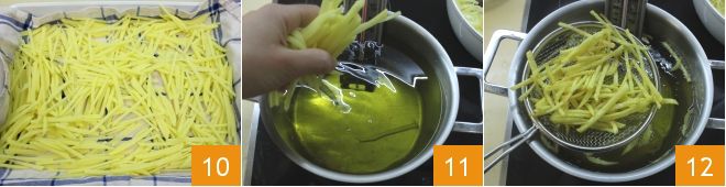 Meanwhile, drain the potato sticks and dry them on a towel 10, then fry them in plenty of seed oil, making sure the oil maintains a temperature of 340°F-355°F 11. Fry the potatoes a few at a time for a few minutes, then drain them 12,