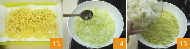 let them dry on a tray covered with absorbent paper 13 and keep them warm. In the meantime, the onions will have finished cooking and will be soft 14; add the cod pieces 15 and cook for a few minutes.