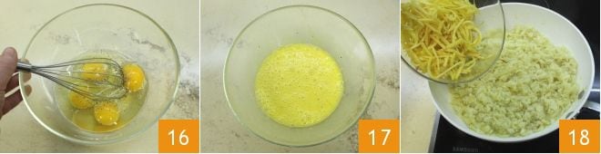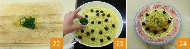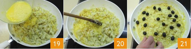 Also add the beaten eggs 19 and stir again with a wooden spoon 20 to incorporate the eggs well, which should remain creamy (alternatively, you can transfer the mixture to a bowl and then add the eggs so they do not set). Garnish with black olives 21;