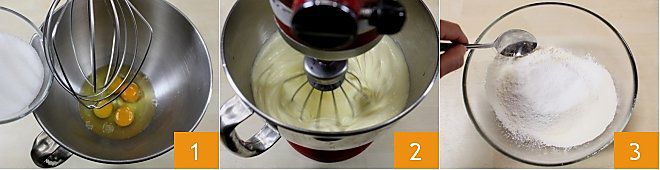 To prepare the coffee cream kisses, start by placing the eggs and sugar in a stand mixer (or a large bowl) 1. Beat the ingredients with a whisk until you get a light and frothy cream 2. Then, in a bowl, mix the sifted flour and baking powder 3.