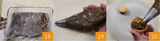 When the coffee cream is ready, turn off the heat and transfer it to a glass container. Cover it with plastic wrap touching the cream 28 and let it cool for about an hour in the refrigerator. After the necessary time, fill a piping bag with a star nozzle with the now cold coffee cream 29, using a spatula or spoon to help. Then take the now-cooled cookies and start filling half of them with the coffee cream 30.
