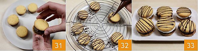 Now place the remaining cookies on each filled half to create your kisses 31. Then transfer them to a wire rack and finish them with melted chocolate, creating small decorative lines on each kiss using a paper cone 32. To make a paper cone, you can consult the cooking school sheet: how to make a cone with parchment paper. If desired, you can whip some fresh liquid cream with powdered sugar and fill your kisses with whipped cream, in addition to the coffee cream, to make them even softer and tastier 33!