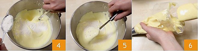 Then remove the whisk and gradually add the flour and baking powder to the cream 4, mixing with a spatula to combine everything. Take a piping bag with a simple nozzle and pour the cream inside, using the spatula to help 6.