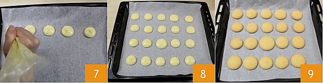 Line a baking sheet with parchment paper and start distributing the cream with the piping bag to create dough disks about 1 inch in diameter 7, trying to space them a few inches apart 8. Bake in a preheated static oven at 374°F for at least 12 minutes (or 338°F if using a convection oven for about 6 minutes) or until the disks have slightly puffed and just start to brown at the edges. Then remove the baking sheet from the oven and let the cookies cool 9.