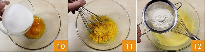 While the cookies cool, start preparing the cream to fill them: in a large bowl, place the eggs and sugar 10 and mix with a hand whisk 11 or an electric mixer until you get a light and frothy cream. Then add the flour 12 and continue to mix the ingredients well.