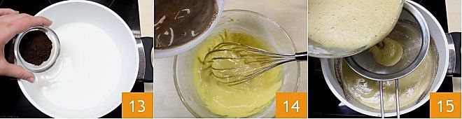 Set the obtained cream aside; meanwhile, pour the milk into a large saucepan. Turn on low heat and warm it up, adding the coffee powder and stirring to dissolve it 13. Bring it just to a boil, then turn off the heat 13. Then pour the milk and coffee mixture into the cream you set aside 14 and mix with the whisk to combine everything. Then transfer this mixture into the same saucepan where you warmed the milk, straining it with a sieve 15. Stir and turn on the heat to thicken the cream. Then turn it off and set aside.